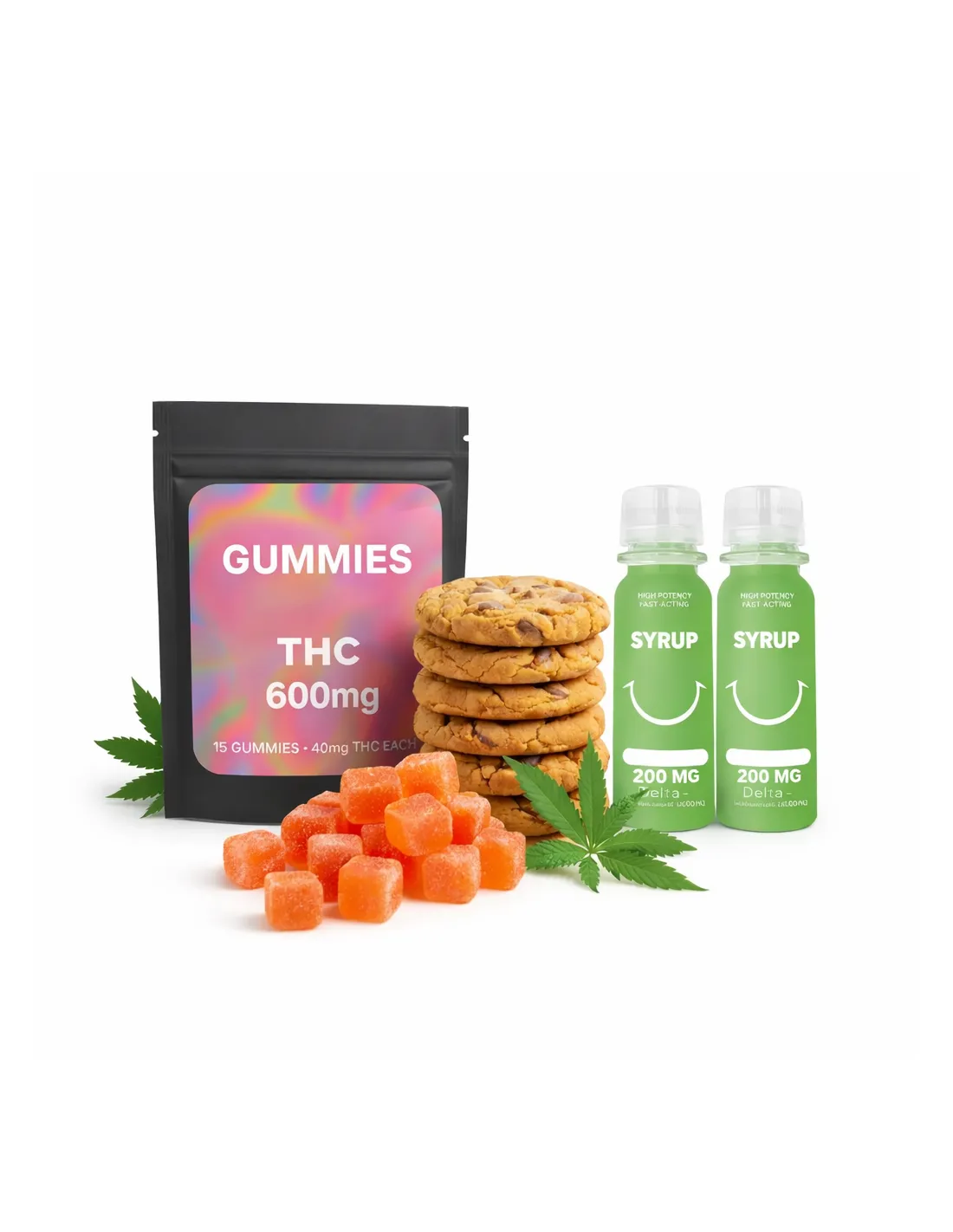 Un bundle équilibré avec gummies, Space Cake Cookies et sirops THC pour un dosage puissant et flexible.